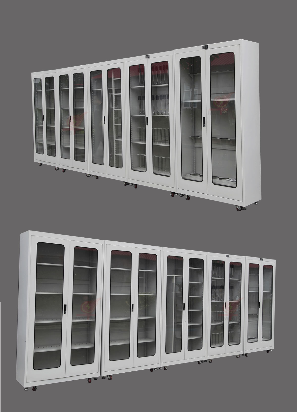 (2)柜體表面為靜電防腐噴塑工藝,顏色為駝灰色,柜門裝有通體透明鋼化玻璃,透過玻璃門可以看到分類有序的各種工器具,便于您的管理。