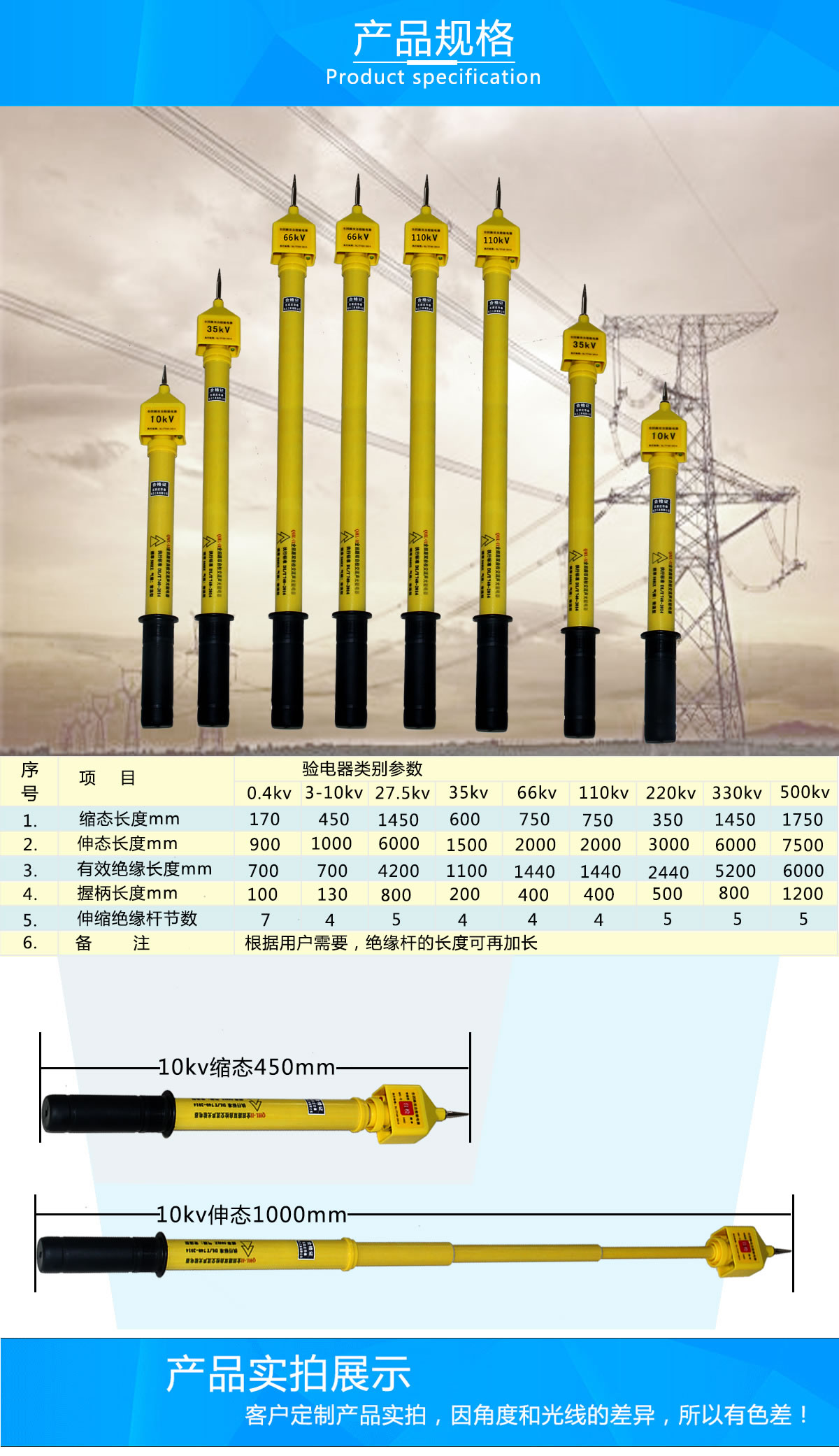 直流驗電器 750V、1000V、1500V 根據(jù)客戶需要,絕緣桿可再加長。