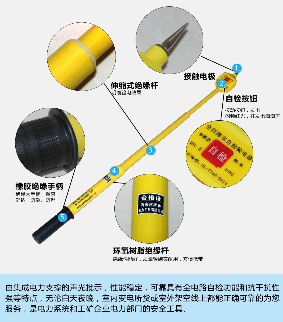 全回路雙自檢交流聲光驗電器是我公司采用國際先進技術和我們雄厚的技術力量以及多年來的制造研究所生產(chǎn)的一款新型交流驗電器,它具有靈敏度高,不受強電場干擾,具有全回路自檢功能,安全系數(shù)高,整體采用閉合電路設計,外殼用注塑ABS工程塑料一次成型,桿體延續(xù)棒狀伸縮環(huán)氧樹脂絕緣桿,耐壓等級及安全系數(shù)比傳統(tǒng)驗電器提高3倍。