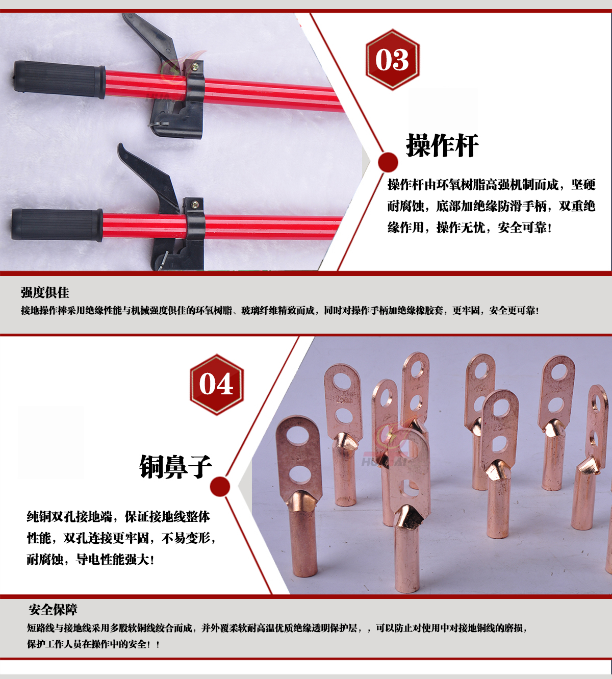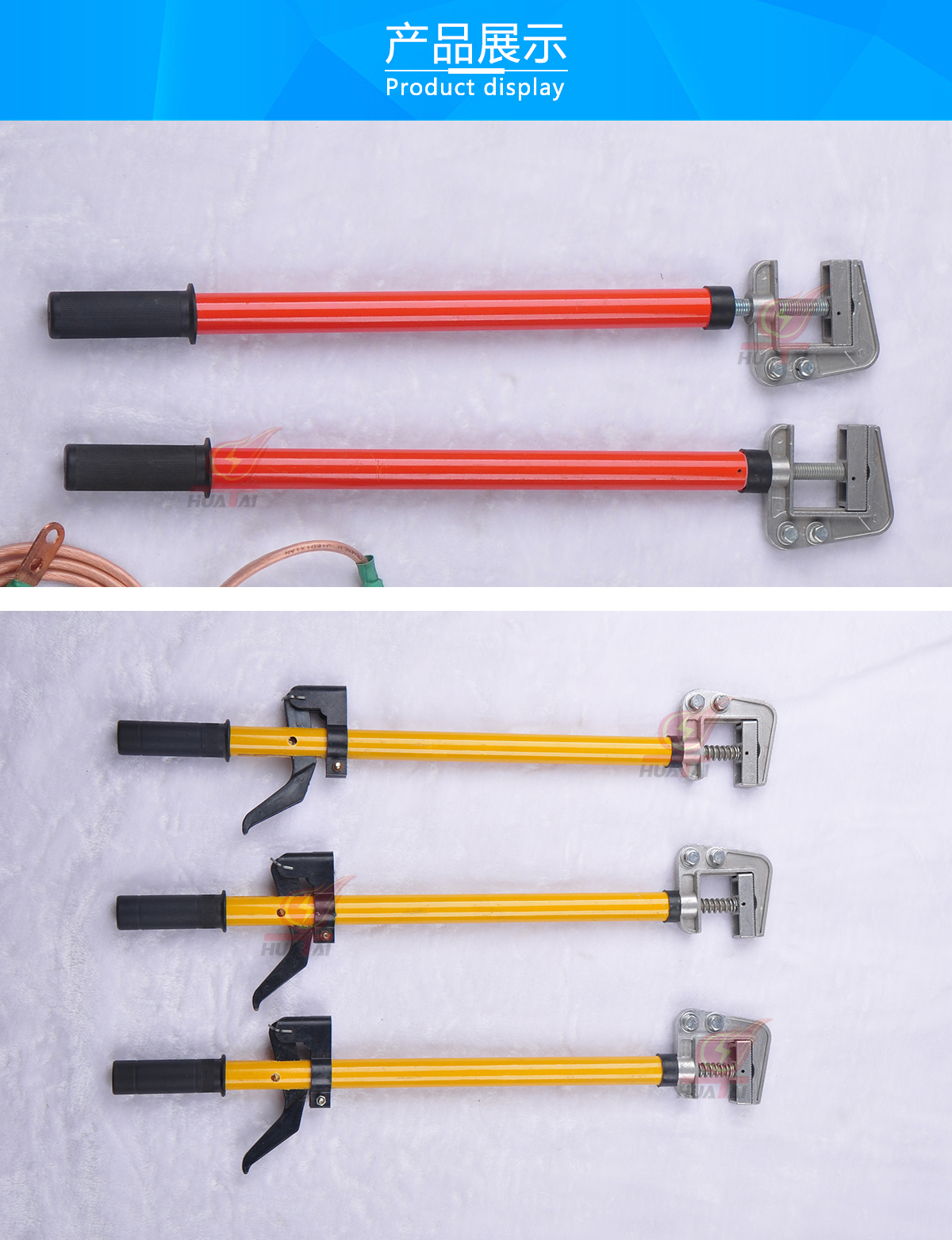導(dǎo)線夾、接地夾是采用優(yōu)質(zhì)鋁合金壓鑄成形;操作棒采用環(huán)氧樹脂彩色管,絕緣性能好,強(qiáng)度高、重量輕、色彩鮮明、外表光滑;接地軟銅線采用多股優(yōu)質(zhì)軟銅線絞合而成,并外覆柔軟、耐高溫的透明絕緣護(hù)層,可以防止使用中