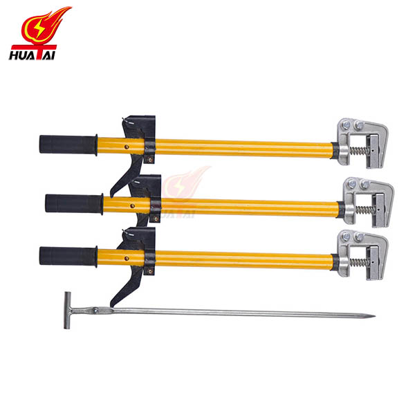 (2)110KV黃色手拉式接地線安裝:將接地軟銅線分相上雙眼銅鼻子固定在接地棒上的接電夾(接電夾有固定式和活動式)相應(yīng)位置上,將接地線合相上的單眼銅鼻子固定在接地夾或地針上,構(gòu)成一套完整的接地線。