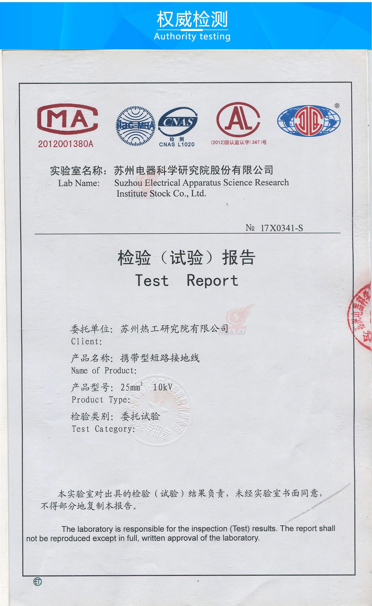 (2)35KV黃色手拉式接地線 標稱截面:25mm2 總根數(shù):810 平均直徑(mm):0.2mm 計算截面:(mm2):25.43 金屬接頭部分長度:50 mm 節(jié)數(shù):1 桿徑:30mm