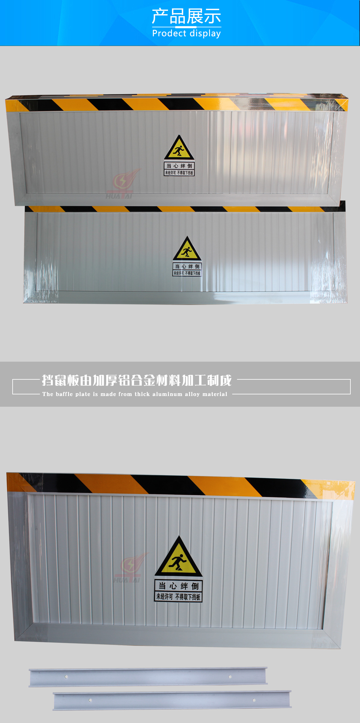 新型鋁合金材質(zhì)擋鼠板替代老式擋鼠板材,實用、結(jié)實、耐用、使用時間長。由擋鼠板主板面和卡槽夠成,外觀可見部分為鋁合金定制,且貼有黃黑色的反光警示貼。