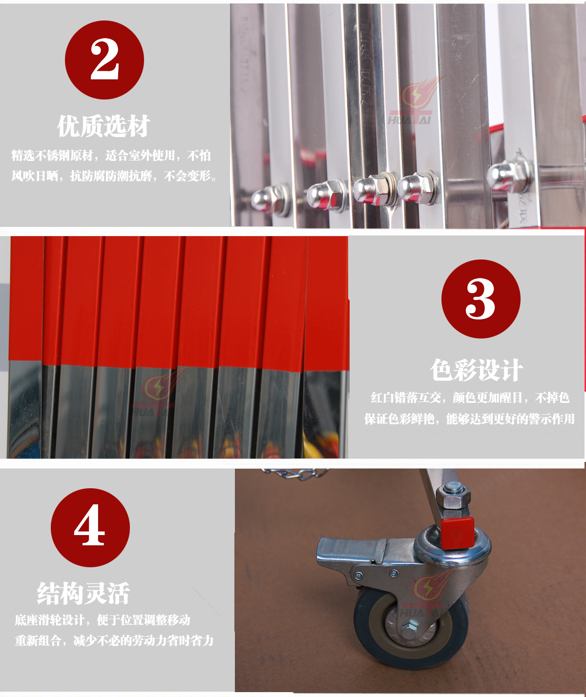 4.顏色:此款安全圍欄的顏色為紅白相間,顏色鮮艷而醒目,能夠達(dá)到安全警示的作用。
