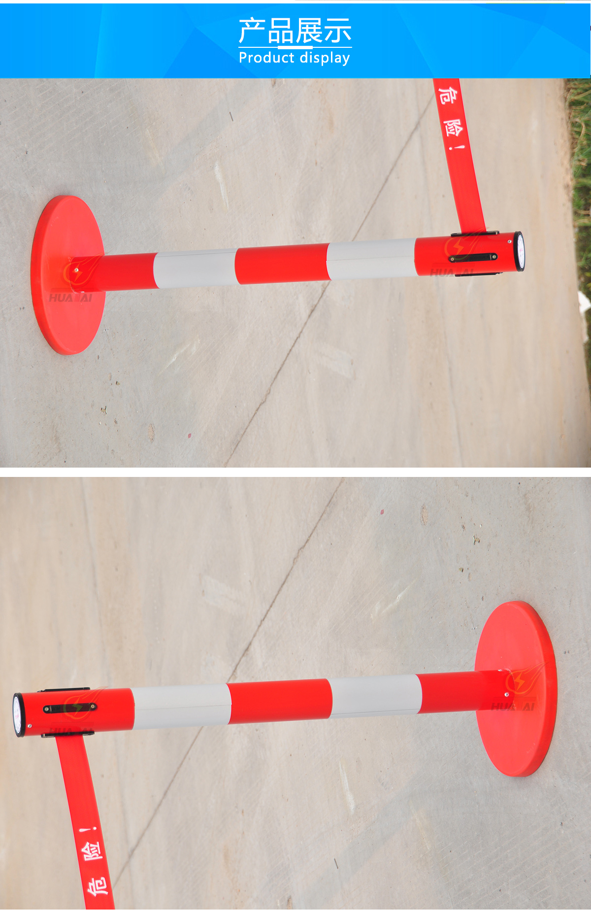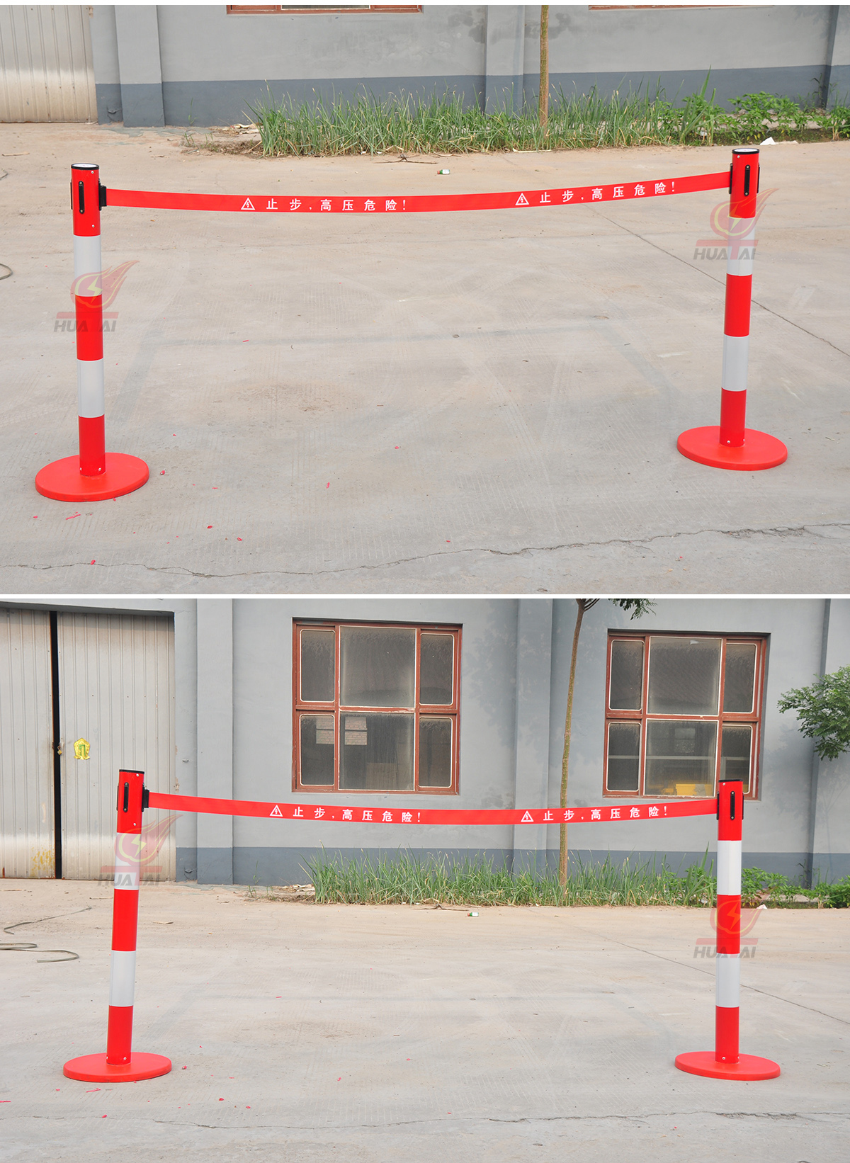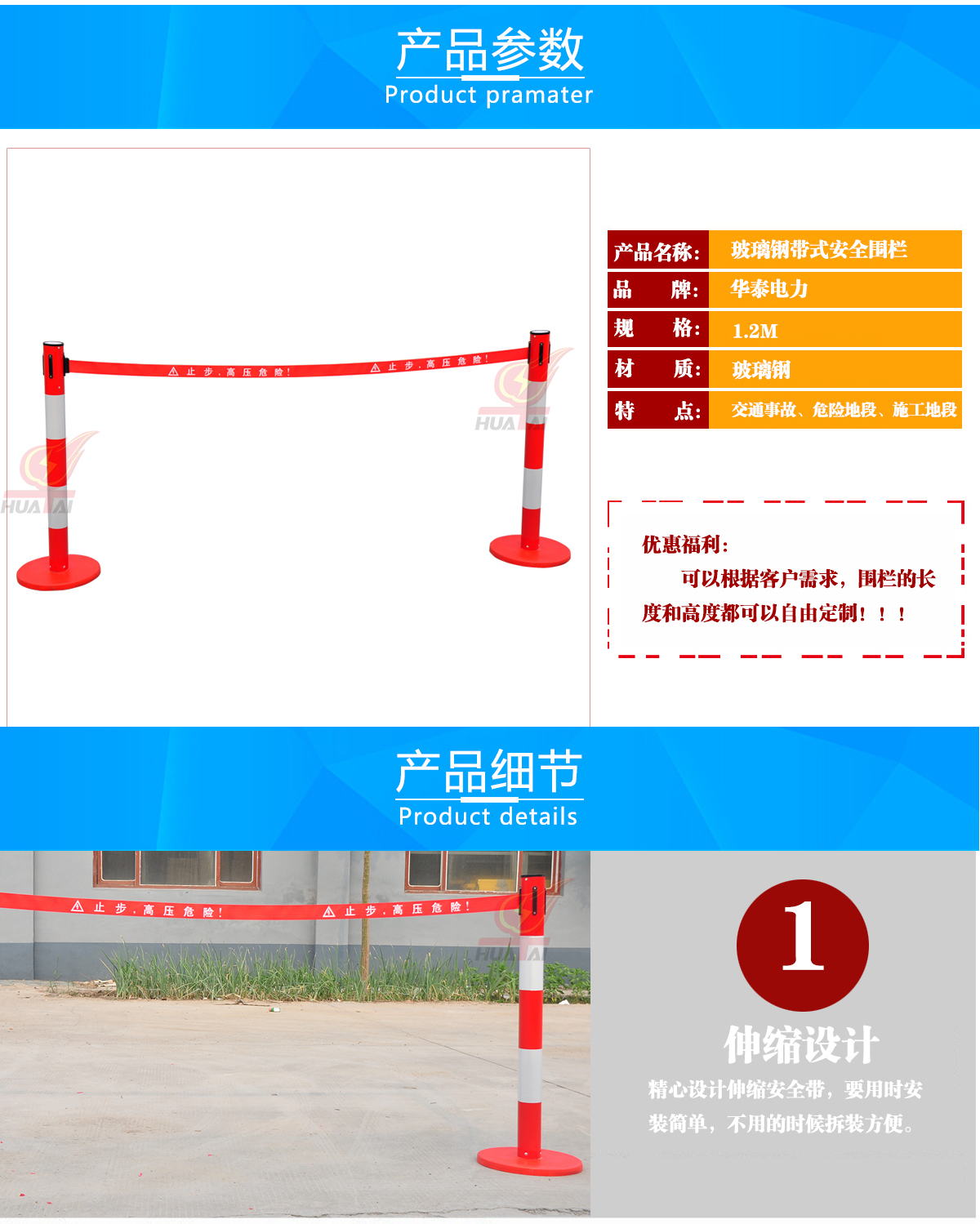 玻璃鋼帶式伸縮圍欄 高度1米,筒體的直徑是76mm,筒的壁為0.8個(gè)厚,底盤(pán)是 350mm。     帶子最長(zhǎng)做到5米,帶寬5cm ??梢噪p層也可以單層帶子,兩層帶子的間距30厘米,一般是上紅下黃,紅色帶子上印 黃字(白字),黃色帶子上印紅字。這樣比較醒目。字分熒光字和普通字。 “閃電符號(hào) 止步 高壓危險(xiǎn)/危險(xiǎn)/止步 危險(xiǎn)”  等等,可以根據(jù)客戶(hù)要求定做。每根立柱上都含有帶子,四個(gè)方向都可以掛帶子。熒光式安全警示帶圍欄,產(chǎn)品設(shè)計(jì)精美,使用靈活,隨意伸縮,隨意間距,和分割 形狀,無(wú)限連接等特點(diǎn)。