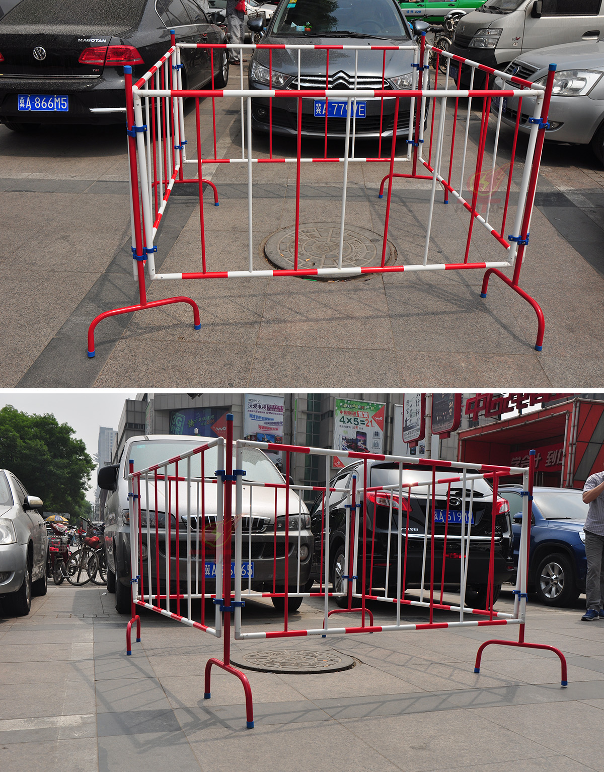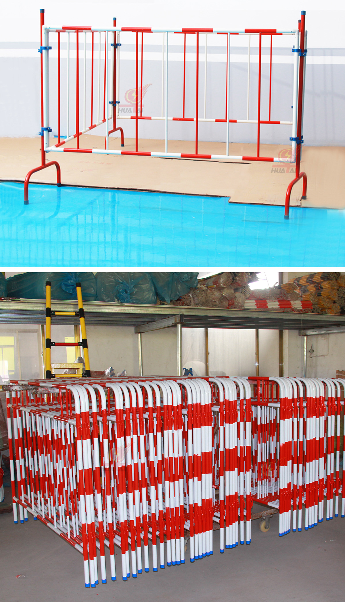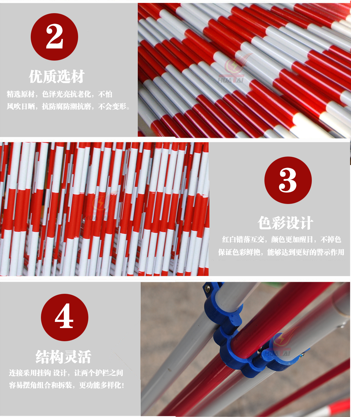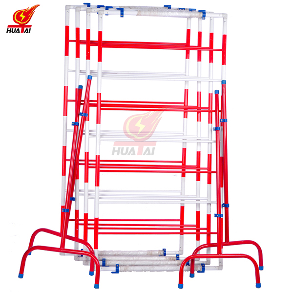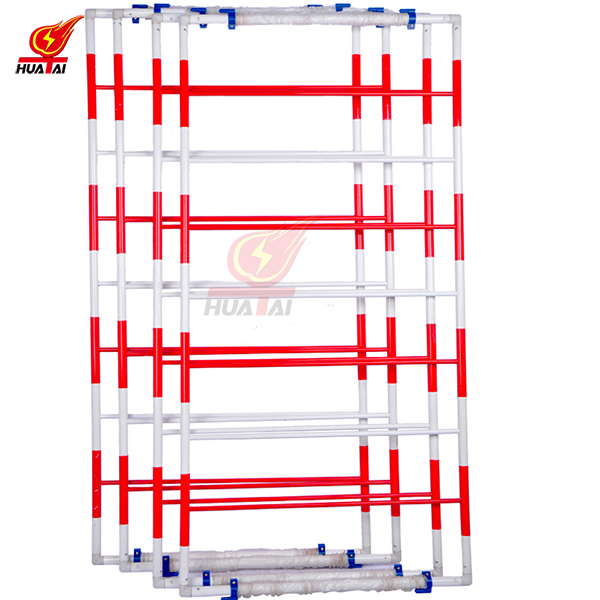 圍網(wǎng)為紅白相間;外形美觀;圍網(wǎng)的上邊沿配“止步,高壓危險”警示牌; 支撐桿采用鐵桿、不銹鋼、環(huán)氧樹脂等材料制成, 上面設有掛鉤或夾子, 可以牢固張掛聚酯網(wǎng), 使之不易被掀起脫離; 底座有鑄鐵和收縮式鐵叉等,可供用戶選擇搭配使用。