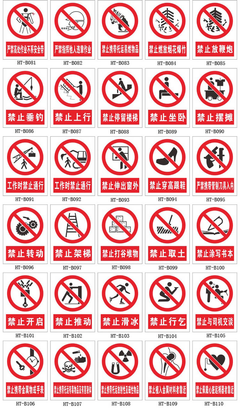 3.禁令類PVC材質(zhì)安全警示牌:通常為圓形,白底紅邊,紅斜杠黑色圖案。是根據(jù)街道、公路和交通量情況對車輛加以禁止或適當(dāng)限制的標志。如禁止通行、禁止停車、限制速度、限制重量、限制寬度等。